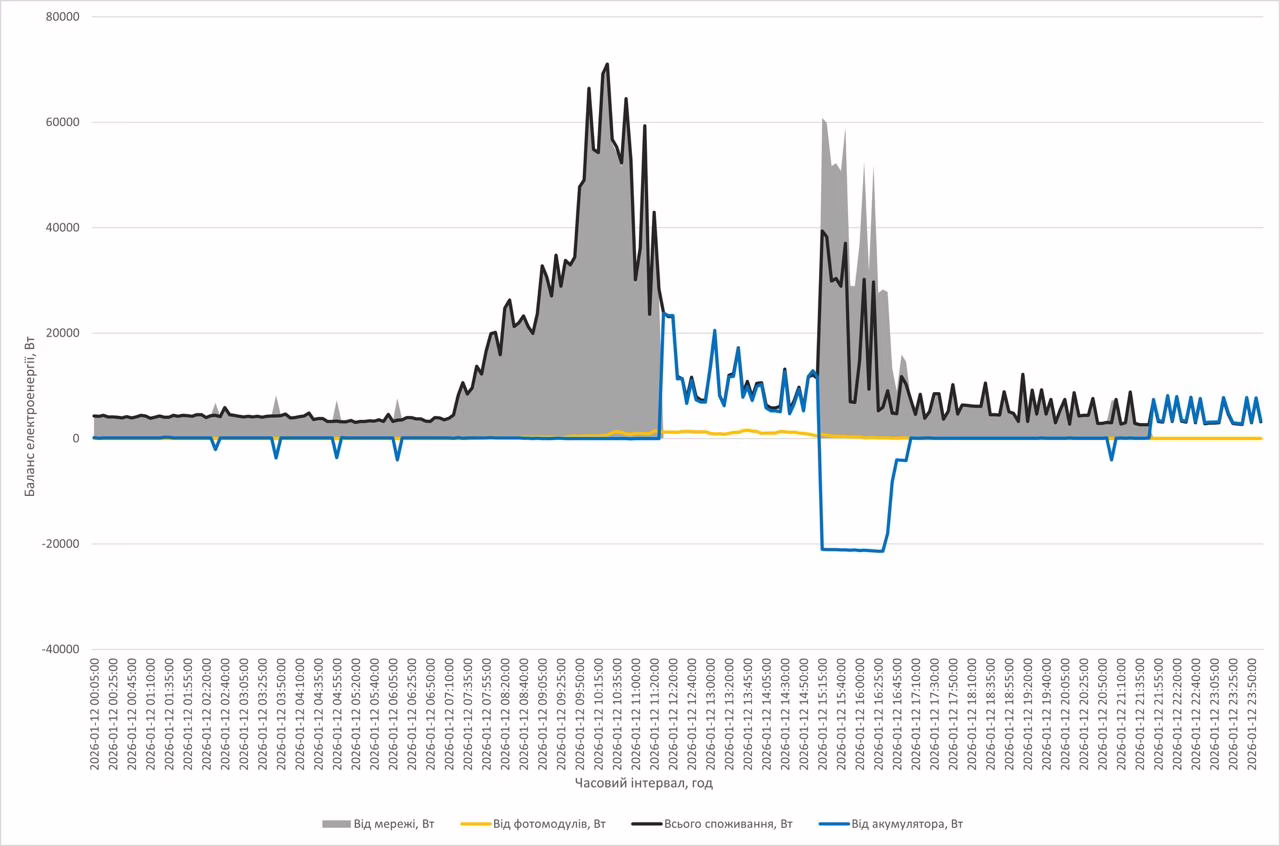 На добовому графіку за 12 січня добре видно, як система працювала в умовах відключень. У період повного знеструмлення з 11:20 до 15:15 лікарня працювала завдяки акумуляторам, які забезпечували живлення критично важливого медичного обладнання. Після 15:15, коли електропостачання з мережі відновилося, на графіку видно, що обсяг електроенергії, який надходив з мережі, перевищував поточне споживання лікарні. Це означає, що в цей час акумулятори заряджалися.