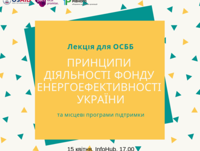 15 квітня о 17.00 в Інформаційно-освітньому просторі «Інфохаб» (м. Рівне, вул. Словацького, 3а) для мешканців багатоквартирних будинків та голів ОСББ відбудеться семінар «Принципи діяльності фонду енергоефективності України». Захід організовано в рамках проекту «Залучення громади Рівного до впровадження реформ», що реалізується об’єднанням громадських організацій «Рада реформ Рівного».