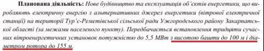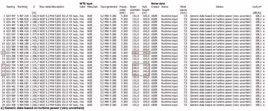 Згідно зі звітом (стор. 7), висота вежі вітроустановки має бути 100 метрів, а діаметр ротора — 151 метр. Проте в додатку № 27, де безпосередньо розраховується рівень шуму для окремих вітряків (№ 13, 17-20), використані зовсім інші параметри: висота вежі 140 метрів, а діаметр ротора 160 метрів. Оскільки гучність роботи станції прямо залежить від розмірів вежі та гвинтів, такі розбіжності ставлять під сумнів головний висновок: чи дійсно шум від ВЕС буде в межах норми.